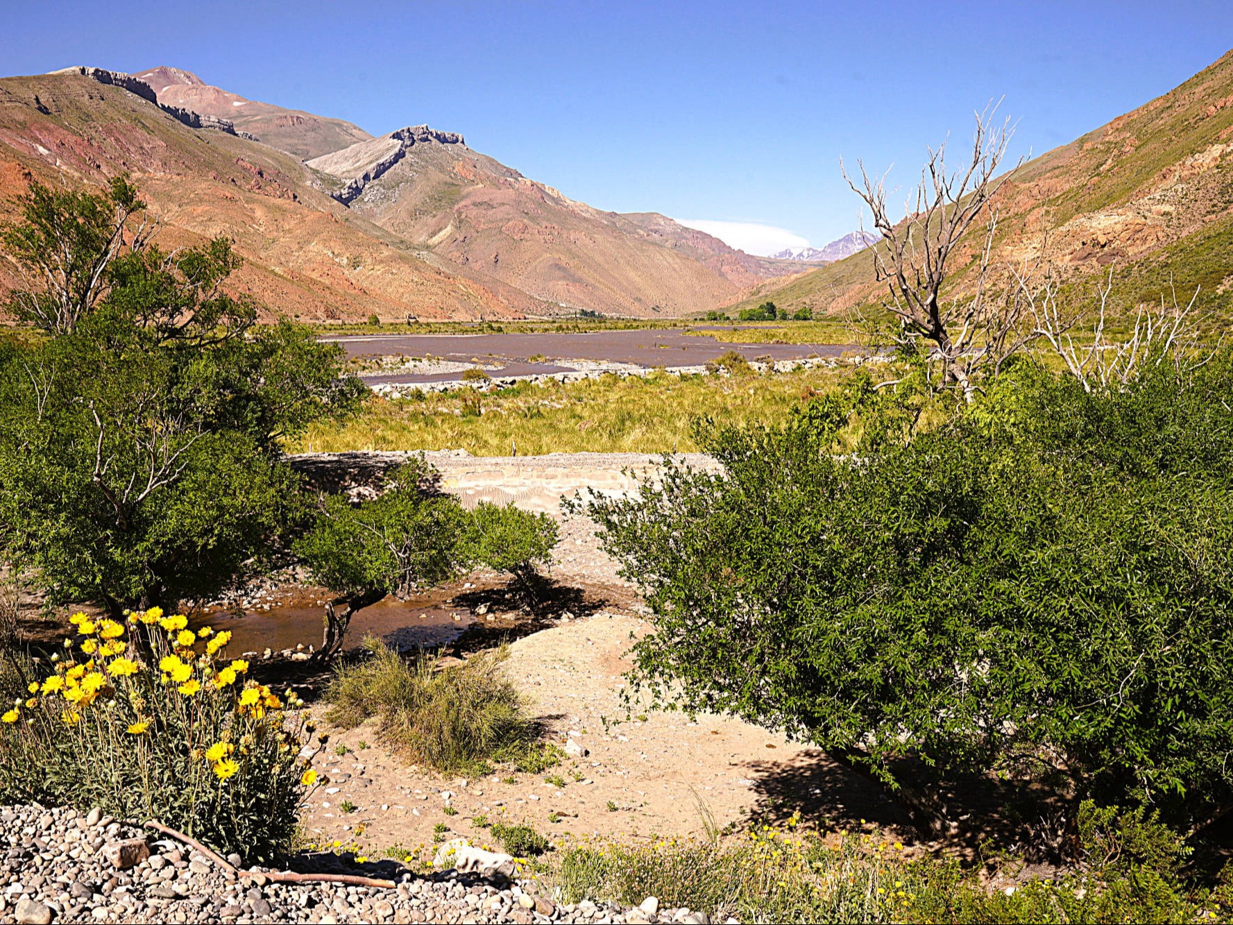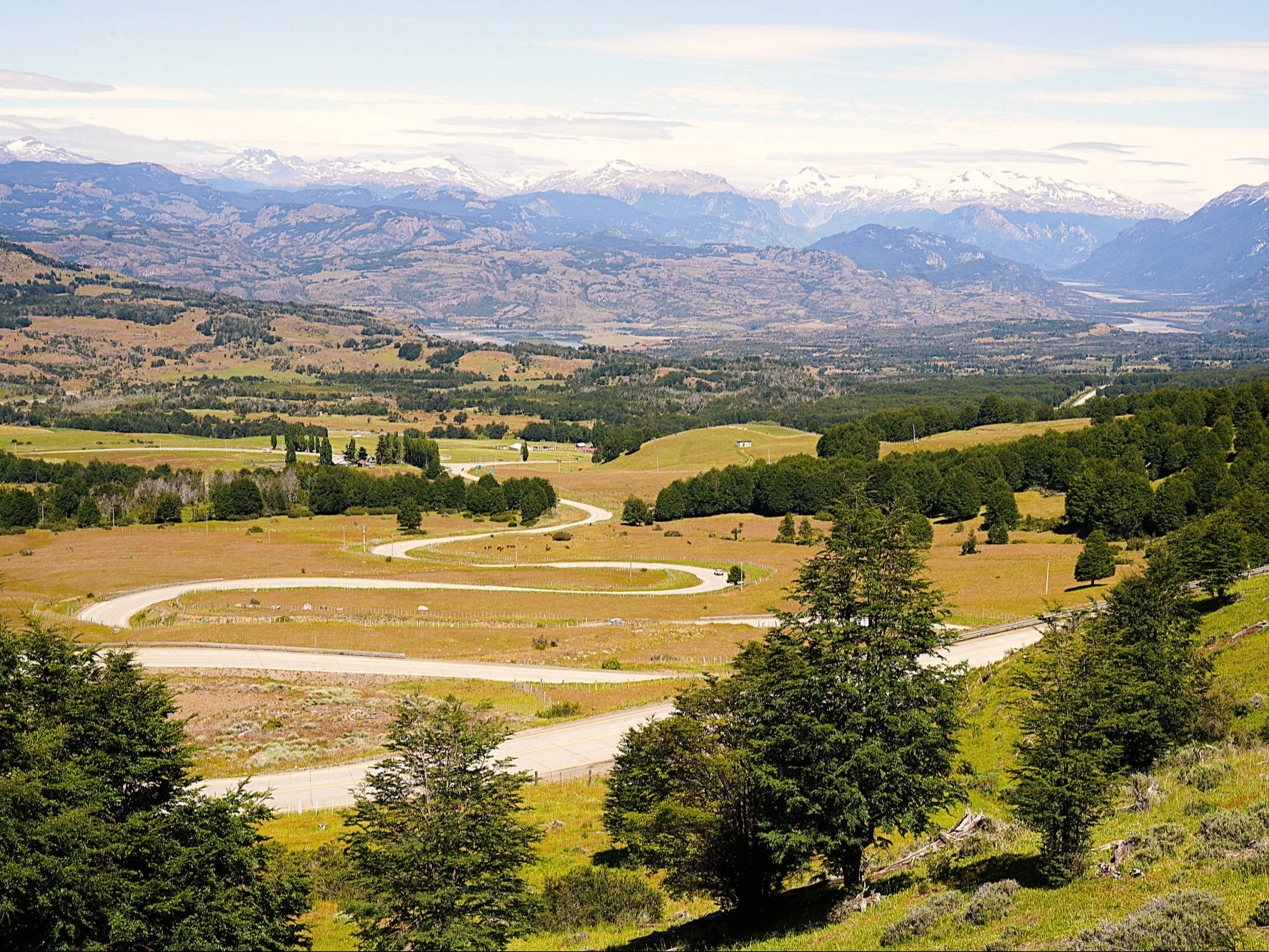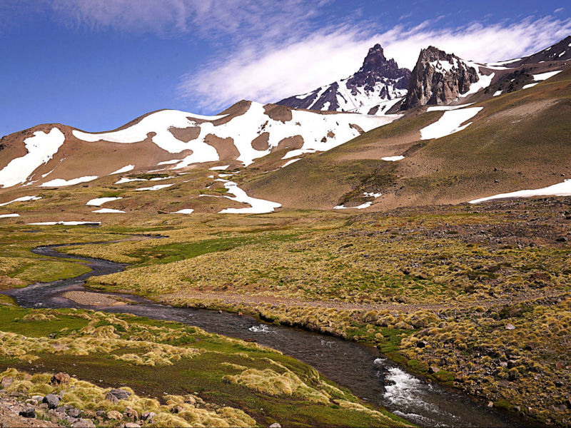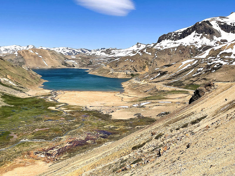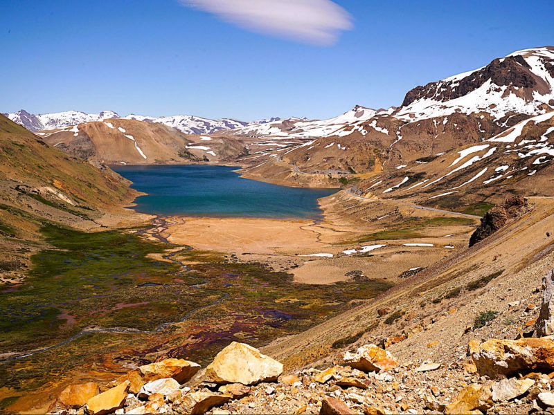Wir: folgen der Ruta Nacional 40 nach "Malargüe", doch je weiter wir in den Süden vordringen, desto mehr nehmen die grünen Rebenfelder ab und schreitet stattdessen die Versteppung voran. Ausländische Investoren, hauptsächlich Franzosen und Holländer, investieren zunehmend im "Valle de Uco" in Weingüter, teure Weinboutiquen und Hotels, die sehr idyllisch in die Bergen der "Cordón del Plata" eingebettet und von der majestätischen Andenkordillere bewacht werden. Wir überqueren den "Rio de Tunuyán" und skurrile Vulkankegel in Lavafeldern prägen zunehmend diese dürre Landschaft. Sie werden später von der typischen semiariden Andenlandschaft mit niedrigen, teils herrlich gelb blühenden Büschen abgelöst. Der "Rio Grande" windet sich durch diese karge Umgebung, bildet kleine Oasen aus oder gräbt sich tiefe Schluchten. Am Horizont zeichnet sich der Vulkan "Payún Matrú" ab, um den sich eines der größten Lavafelder, der "Campo de Piedra Pómez", erstreckt. Kurz vor "Bardas Blancas", der seinen Namen den nahezu weißen Felsklippen verdankt, verlassen wir die Ruta Nacional 40 und biegen auf die Ruta Nacional 145 in die Andenkordillere ab, die Argentinien mit Chile über den "Paso de Pehuenche" verbindet. Etwa 30 km vor dem Pass parken wir vor zwei Containern, um uns und unsere Motorräder aus Argentinien auszuchecken. Schneebedeckte Vulkangipfel, schroffe Hänge, dazwischen grüne Wiesen, auf denen halbwilde Pferde grasen, prägen unsere Auffahrt zum 2.553 m hohen Pass. Vor uns erstreckt sich der geradezu märchenhaft schöne, etwa 70 km² große aufgestaute Stausee "Laguna del Maule". In seiner Caldera befinden sich mehrere kleine Stratovulkane, Lavadome und Pyroklastische Kegel. Die Caldera liegt in dem Vulkanfeld "Laguna del Maule", das eine Fläche von 500 km² umfasst und mindestens 130 Vulkanschlote enthält. Nordöstlich der "Laguna del Maule" zeichnen sich mehrere über 3.000 m hohe Berge ab, viele davon sind erodierte Vulkane. Dieses Panorama mit der blauschimmernden Laguna vor der schneebedeckten Andenkulisse ist absolut spektakulär und beeindruckt uns zutiefst. Nach 25 km erreichen wir den chilenischen Zoll. Wieder werden unsere Taschen und Koffer intensiv nach eventurell unerlaubt eingeführten Lebensmitteln durchsucht und im Gegensatz zur letzten Kontrolle konfiszieren die freundlichen Zöllnerinnen eine verschlossene Tüte mit Nüssen. Vielleicht verspürten sie Gelüste nach den Knabbereien? Wir verlassen diese faszinierende Gebirgslandschaft: vor uns öffnen sich die grünen und fruchtbaren Täler der "Región del Maule", in denen neben Obst und Landwirtschaft intensiv Weinreben angebaut werden, aus deren Trauben 50 % aller hochwertigen Exportweine Chiles gewonnen werden. Aus der im Gegensatz zur grauen argentinischen Seite dichtbegrünten Vegetation erhebt sich kurz vor "Talca" der 3.830 m hohe Vulkan "Descabezado Grande". Unser Hotelzimmer in "Talca" reiht sich auf der Liste unterirdischer Räumlichkeiten sehr weit oben ein: um die zwei Betten in dem fensterlosen Raum ist kaum Platz zum Gehen, geschweige denn, um unser Gepäck unterzubringen. Die externe Toilette teilen wir uns mit 3 anderen Zimmern und wegen der nicht existierenden Schallisolierung durch die papierenen Trennwände nehmen wir intensiv am Leben unserer Zimmernachbarn teil. Aber unsere Motorräder stehen sicher und das hat stets oberste Priorität. Die hügelige, mit gelbem Gras und niedrigem Buschwerk bewachsene Landschaft auf unserem Weg zurück zum Pazifik erinnert uns sehr an Kalifornien. Wir schlängeln uns entlang des Wasser zuerst durch herrliche Felder von in voller Blüte stehender gelber Lupinen, danach entlang des goldgelben Sandes der "Dunas de Putú". Ständig überholen wir mit Holzstämmen schwer beladene LKW's, die ihre Last aus den abgeholzten Berghängen in eines der vielen Sägewerke transportieren. Die Natur ist aus dem Winterschlaf erwacht, die Wiesen sind mit Wildblumen übersät und in den Vorgärten der eher schmucklosen Häusern sprießen farbenfrohe viele Rosen. "Concepción" (1550) am "Rio de Bío-Bío" wurde im Laufe der Jahrhunderte von vielen Erdbeben mit meist massiven Zerstörungen heimgesucht. In der Universitätsstadt sind wir am zentralen "Plaza Perú " die einzigen "Silberhäupter", denn um uns wuselt es nur so von Studenten, die die vielen Kneipen und Bars, aus denen laut "unsere" Musik aus den 60-70ger Jahre erschallt, bevölkern. Die Ruta N-55 windet sich durch ländliche Gebiete mit kleinen Dörfern wieder in eine höhergelegene Bergregion, deren Berghänge intensiv abgeholzt wurden. Wo es Vulkane gibt, müssen wir nach Thermalquellen oftmals nicht lange suchen. Umgeben von den schneebedeckten Andengipfeln des winterlichen, 1.650 m hohen Skigebiets "Termas de Chillán" springen wir nach staubreicher Zufahrt in das durchschnittlich 60 °C heiße Wasser der gleichnamigen Quellen. Über eine steile Wiese verteilen sich 3 runde Becken, an deren Rand ein Container mit Umkleidekabinen steht. Zweidutzend Stühle stehen den Badenden zur freien Verfügung, nirgends entdecken wir ein wenig Schatten und abends sind wir krebsrot. Der Komfort hält sich für teure 27,00 Euro Eintritt/Person doch sehr in Grenzen, aber das heiße Wasser tut unseren vom Motorradfahren verspannten Muskeln gut. Wir übernachten in einer kleinen "Cabaña" mit offenem Kamin, vor dem wir einen unserer "Malbec's" aus "Cafayate", muskulär völlig entspannt, süffeln. Über Stock und Stein werden wir auf dem Weg nach "San Miguel" mit Feinstaub braun überzuckert. Lässig wirbeln wir noch mehr Dreck auf der 60 km langen Baustelle zwischen "Los Angeles" und Angol auf. Endlich lassen wir die stark abgeholzten Waldgebiete hinter uns. Große Weizenfelder, grüne Weiden oder bunte Wiesen überziehen wie ein Teppich die leicht hügelige Landschaft, die uns zunehmend an die Heimat erinnern. Aus dem weiten Tal um "Temuco" tauchen wir in eine noch intakte Waldregion mit Araukarien- und Mischwäldern ein. 