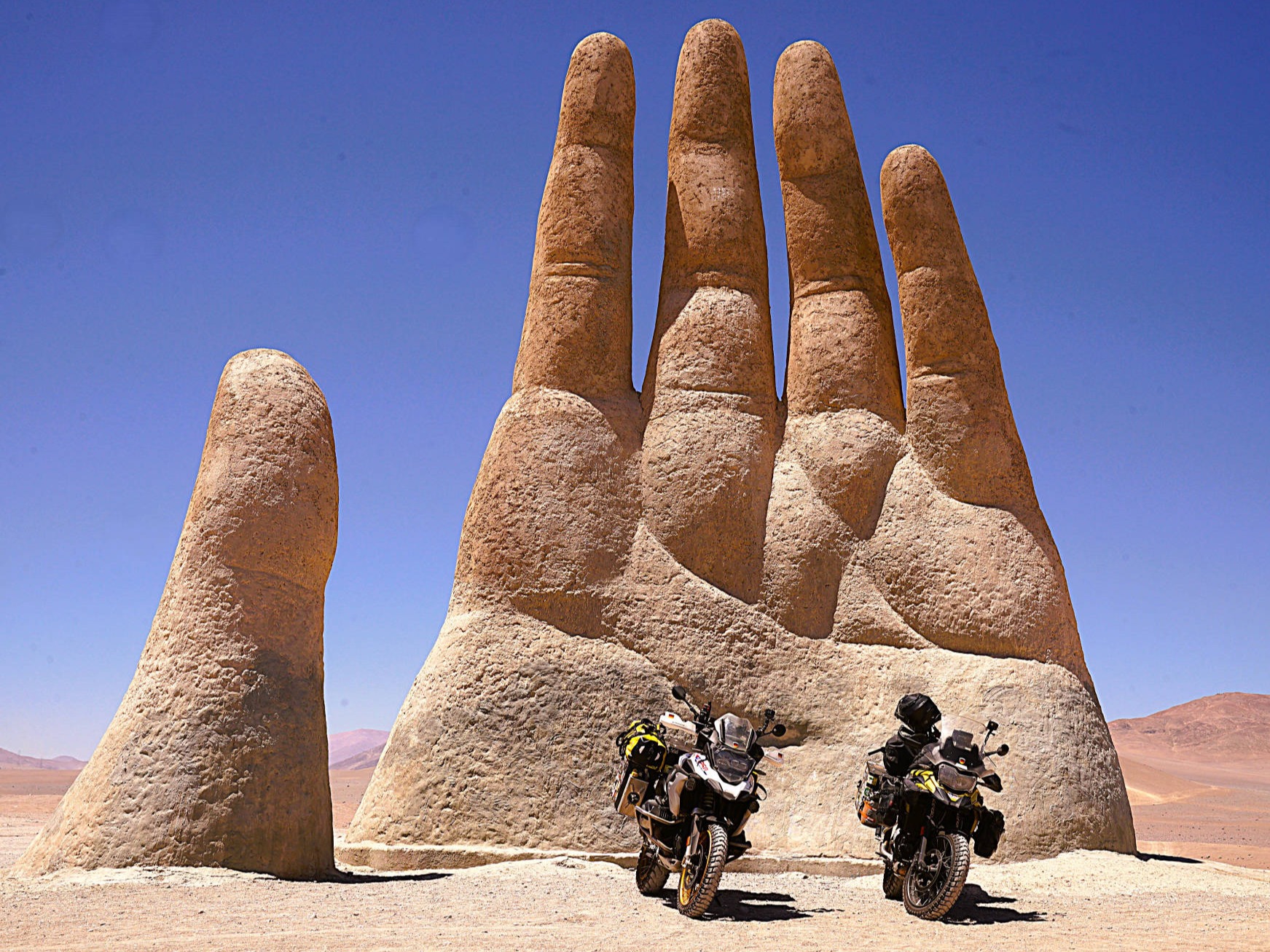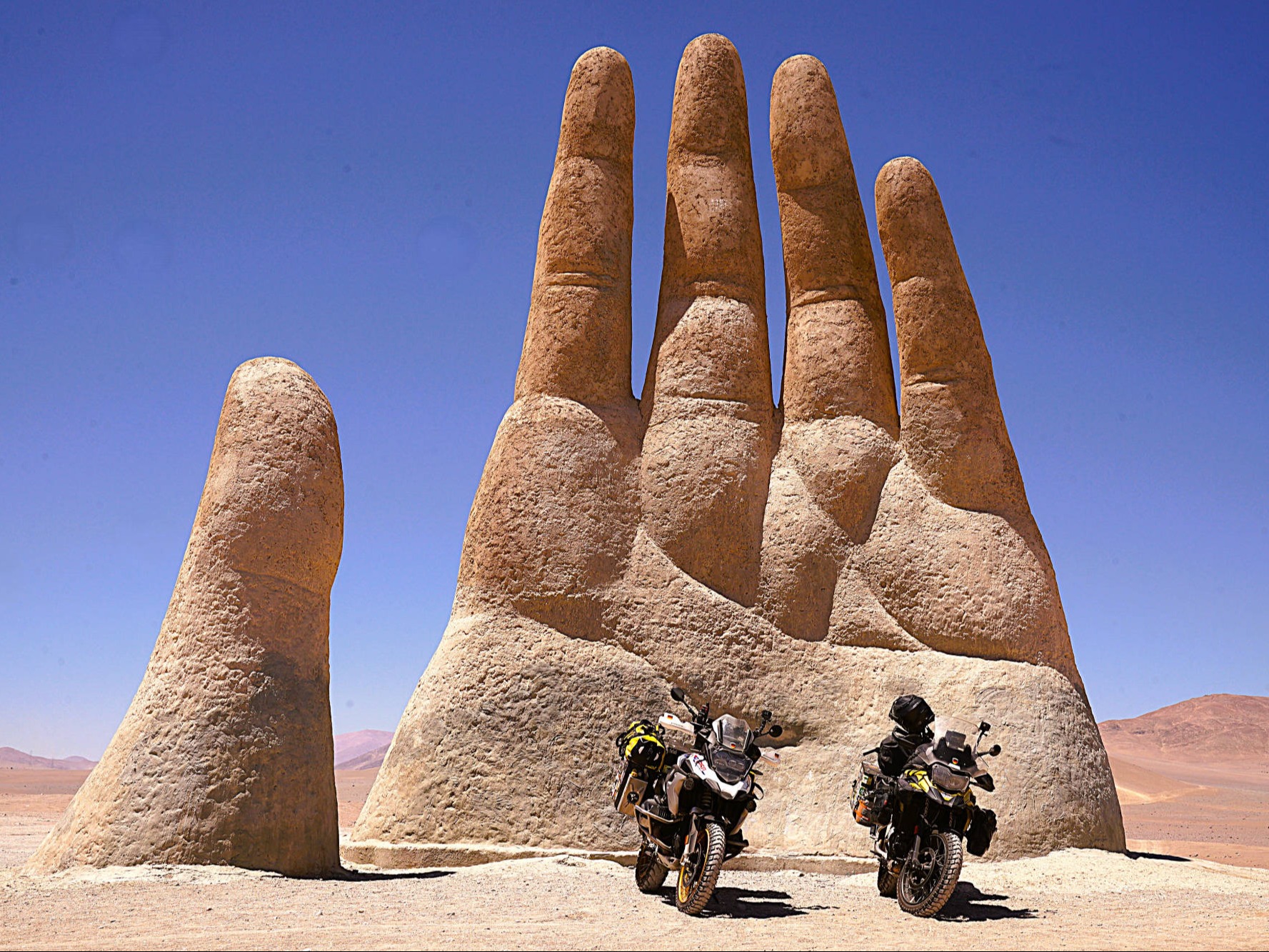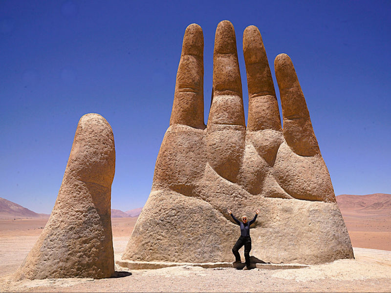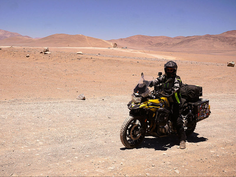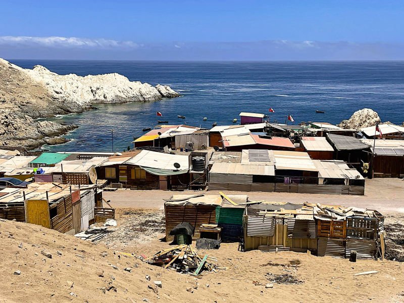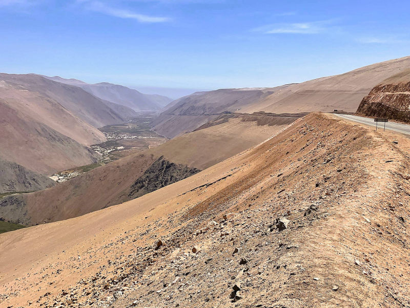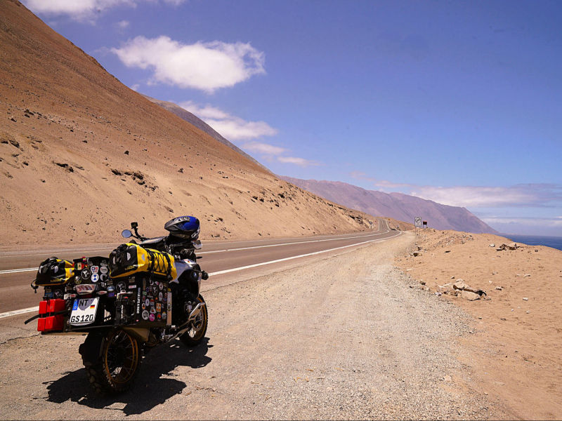 Am 6. November 2025 überqueren wir bei "Arica" die Grenze nach Chile. Die südlichste Stadt unserer Reise: "Ushuaia" erscheint in erreichbare Nähe zu rücken, obwohl uns noch mehrere tausend Kilometer davon trennen. Wegen der Regenzeit in Südperu und Bolivien von November bis März angeln wir uns auf der "Panamericana Sur" die Küste bis "Antofagasta" entlang. Ab 9. Dezember 2025 wollen wir auf der "Navimag Fähre Esperanza" durch die traumhafte Inselwelt und Fjorde Südchiles von "Puerto Montt" nach "Puerto Natales" crusen, um unser südlichstes Ziel "Ushuaia" rechtzeitig vor Weihnachten zu erreichen. Unsere Route von "Arica" nach "Pozo Almonte" führt uns auf der "Panamerica Sur" zunächst durch das fruchtbare "Azapa-Tal" mit seinen großen Olivenhainen. Am Ausgang von "Arica" informiert uns ein Schild, dass die nächste Tankstelle 259 km entfernt sei. Unsere Tanks sind randvoll und 7 l Ersatzbenzin führen wir zusätzlich mit. Daher beunruhigt uns die Einsamkeit der Passstraße und der starke Gegenwind kaum. Wir sind in der rauen Schönheit der "Atacama- Wüste" angelangt und überqueren über die Pässe "Cuestas de Acha", "Chaca" und "Camarones" nahezu vegetationslose, zerklüftete Gebirge. Die Ausblicke auf tiefe Schluchten und ausgetrocknete Täler sind absolut spektakulär. Nach "Cuya" wird die Landschaft zunehmend flacher und karger, eine schier endlose Weite breitet sich vor uns aus, die nur von Salzpfannen und gelegentlichen kleinen grünen Oasen unterbrochen wird. Diese monotone Kargkeit der Landschaft, die wir in diesem Ausmaß bisher noch nicht erlebt haben, überwältigt uns trotz der unmenschlichen Hitze durch ihre fast surreal wirkende, an eine Marslandschaft erinnernde Schönheit. Kurz vor "Pozo Almonte" zeigt Brigittes Tank Null km an. Wir passieren mehrere Geisterstädte, die der Salpeterbergbau hinterlassen hat und sehen uns schon in der Hitze bei extrem böigem Wind gedanklich im Nirgendwo verloren im Sand. Buchstäblich mit dem letzten Tropfen Benzin erreichen wir eine Tankstelle am Rande von "Pozo Almonte". Das Leben der Einwohner scheint sich in dieser Ansiedlung auf die zentrale Einkaufsstraße zu fokussieren, die uns mit ihren eingeschossigen Holzgebäuden, vorgesetzten überdachten Veranden und - fast stilecht-, einer Pferdekutsche stark an eine amerikanische Westernstadt erinnert. Im "General Store" besorgen wir uns die für Chile notwendigen Elektrostecker und SIM-Karten und erfahren, endlich wieder online, vom Ende der Ampelregierung in Deutschland. In der kargen Wüstenlandschaft entdecken wir immer wieder Bauruinen ehemaliger Salpeterwerke und verlassener Arbeitersiedlungen. Durch den Besitz reicher Salpetervorkommen als Ergebnis der Salpeterkriege und der Friedensabkommen mit Peru (1883) und Bolivien (1904), erreichte Chile beträchtlichen wirtschaftlichen Wohlstand. Mit der Entwicklung neuer Verfahren zur Salpetergewinnung und der Entdeckung des synthetischen Düngers zu Beginn des 20. Jh. verlor der Salpeterabbau seine Bedeutung im internationalen Handel und fand als Devisenbringer in Chile ein Ende. Wir durchqueren die trockene Ebene der "Reserva Nacional Pampa del Tamarugal ", eines der trockensten Gebiete der Welt, bevor wir in "Iquiquen" nach abenteuerlichen Serpentinen wieder den Pazifik erreichen, um entlang der schroffen und steilen Felsenküste der Küstenkordillere "Tocopilla" anzusteuern. Unterwegs beobachten wir Berge nasser und getrockneter "Cochayuyo-Algen", die von Frauen und Männern mühsam aus dem Meer gefischt werden. Für ganze Familien ist das Sammeln und Verkaufen der Algen neben dem Fischfang in diesem strukturarmen Gebiet die einzige Lebensgrundlage. Die Algen, die reich an Nähr- und Ballaststoffen, Mineralien und Vitaminen sind, werden in der Kosmetik- und Nahrungsindustrie verarbeitet. Die "Cochayuyo-Alge" ist ein traditionelles Nahrungsmittel, das schon die "Mapuche"-Ureinwohner kannten und als Superfood nun auch in der Haute Cuisine Einzug gehalten hat. Je mehr wir uns "Tocopilla" nähern, desto dichter ist der Strand mit Bretterbuden, die teils kleine Ansiedelungen ausbilden, verbaut. Als Schutz vor dem starken Wind sind die verlassen wirkenden Häuser mit blickdichten Bastzäunen umschlossen. Was für ein unvorstellbar hartes Leben der Fischer und "Algensammler"! Surreal wirkende, karge Wüstenlandschaften vor felsigen, zerklüfteten Hügeln und gelegentlichen Salzpfannen, mit Farbnuancen von hellem Beige bis zu Rot- und Brauntönen mit dem blauen Pazifik im Hintergrund, schaffen eine außergewöhnliche Kulisse. Wir biegen kurz vor "Antofagasta" ins Landesinnere ab. Wie eine Fata Morgana tauchen aus der flirrenden Hitze der "Atacama Wüste" die riesigen Umrisse mehrerer Industrieanlagen auf. In "La Negra" konzentrieren sich an der "Panamericana Sur" seit der Jahrtausendwende Unternehmen der Bergbauindustrie, u.a. Kupferhütten sowie Produktionsanlagen für Lithiumbatterien. Wegen des hohen Strombedarfs dieser Industrien bedecken gigantische Solarkraftwerke die Wüstenflächen. Die gesamte Stadt ist mit einer feinen weißen Pulverschicht bedeckt, die sowohl von dem örtlichen Zementwerk, als auch von den Verarbeitungsprozessen der Bergbau- und Metallverarbeitungsindustrien herrührt. Die Umweltverschmutzung und die Belastung der hier tätigen Menschen ist erheblich: Giftstoffe wie Schwermetalle belasten Boden, Luft und Wasser. LKW-Konvois verstopfen die 4-spurige Durchgangsstraße und wirbeln den Pulverstaub auf, die ganze Atmosphäre wirkt extrem apokalyptisch. Schnell füllen wir unsere Benzintanks auf, bevor wir wieder in die lebensfeindliche Monotonie der heißen Wüstenebene eintauchen. Von Weitem zeichnet sich am Horizont die Großskulptur "Mano del Desierto" des chilenischen Bildhauers Mario Irarrázabal ab, ein "must-see" und beliebtes Fotomotiv in der dramatischen Schönheit der chilenischen Wüstenlandschaft - gerade auch für Motorradfahrer. Die 1992 geschaffene, 11 m hohe Eisen- und Zementhand soll Gefühle vo