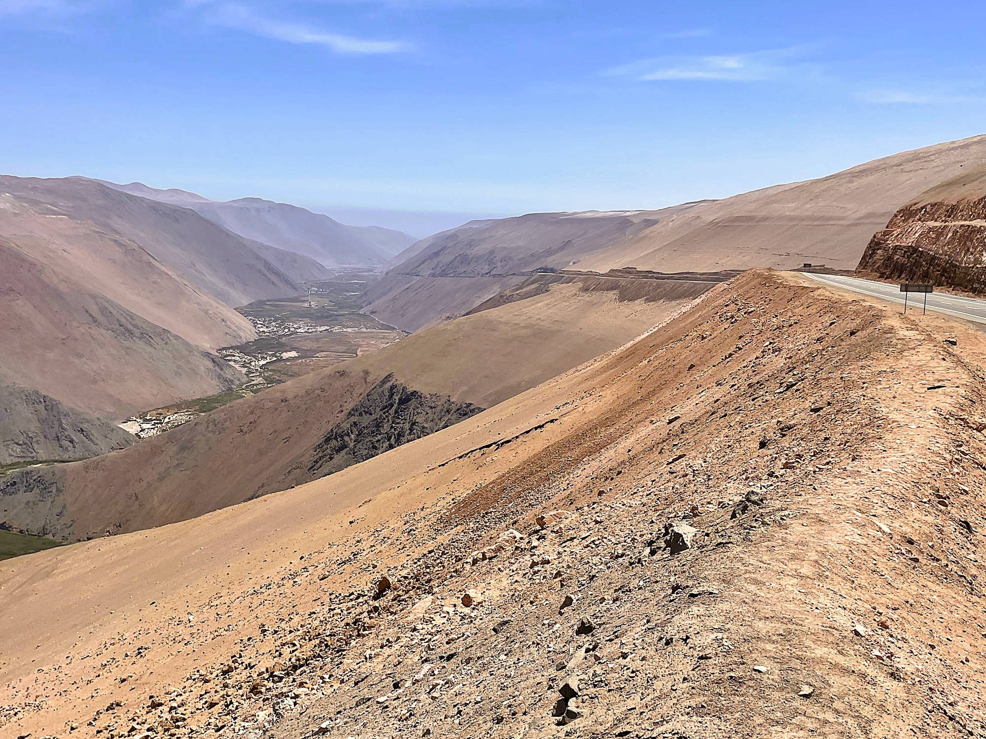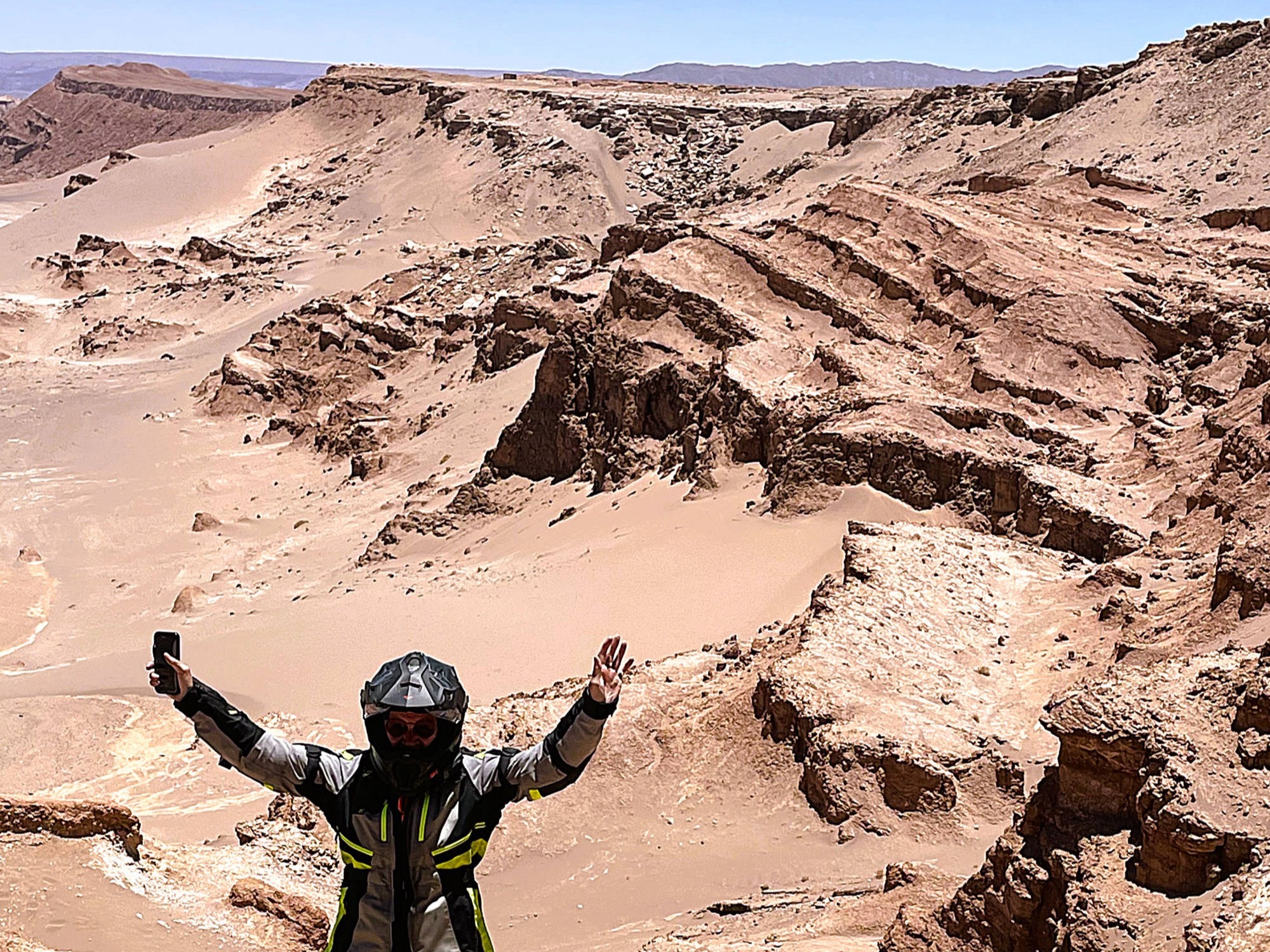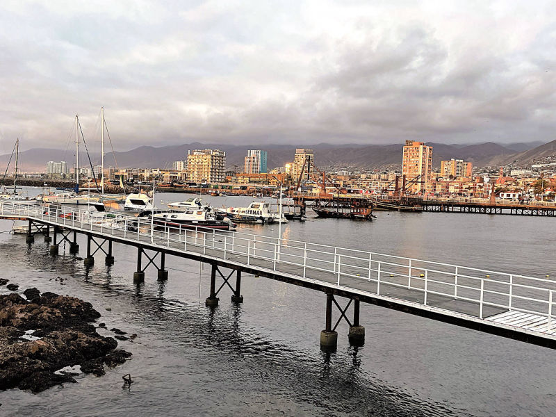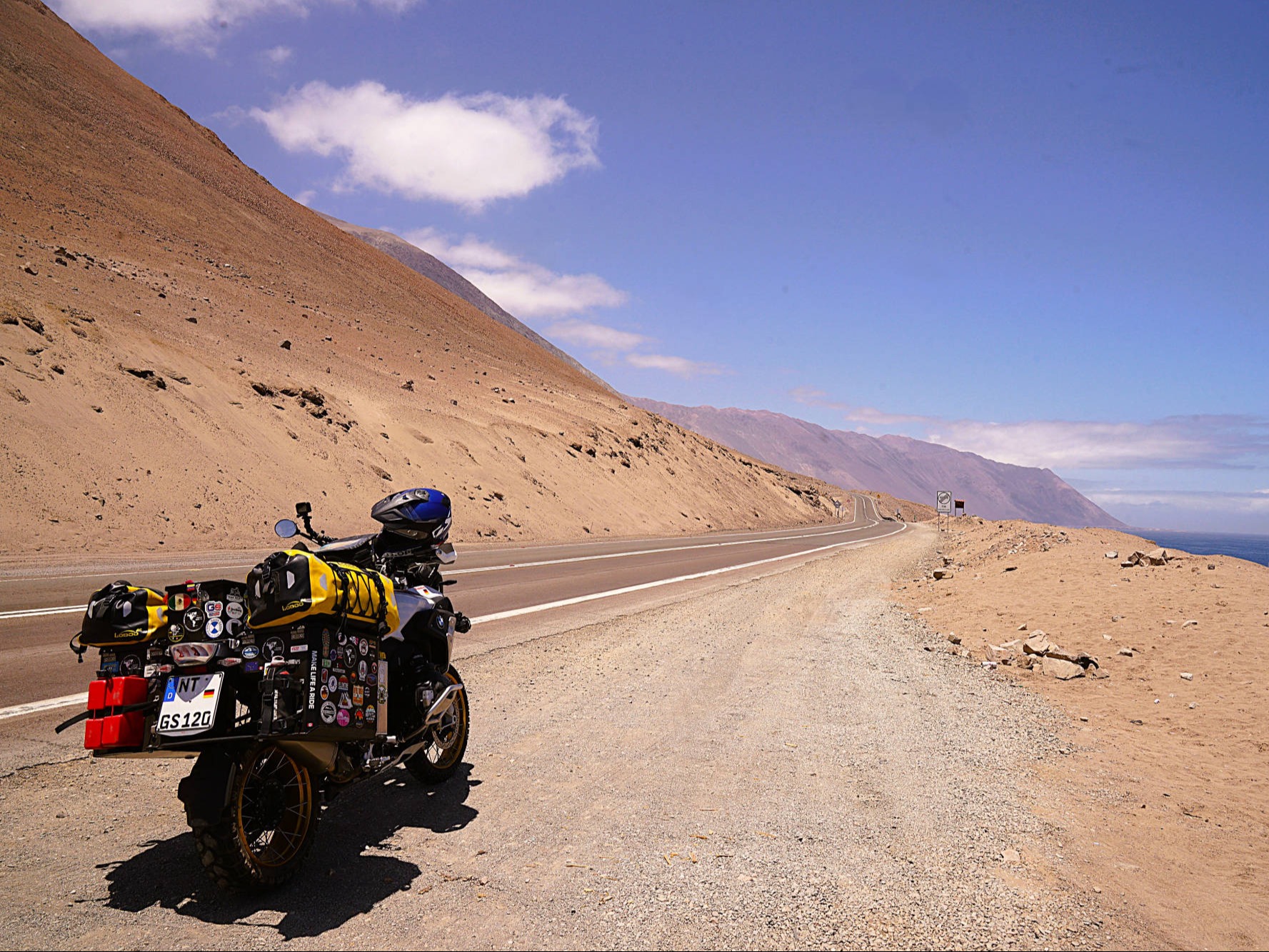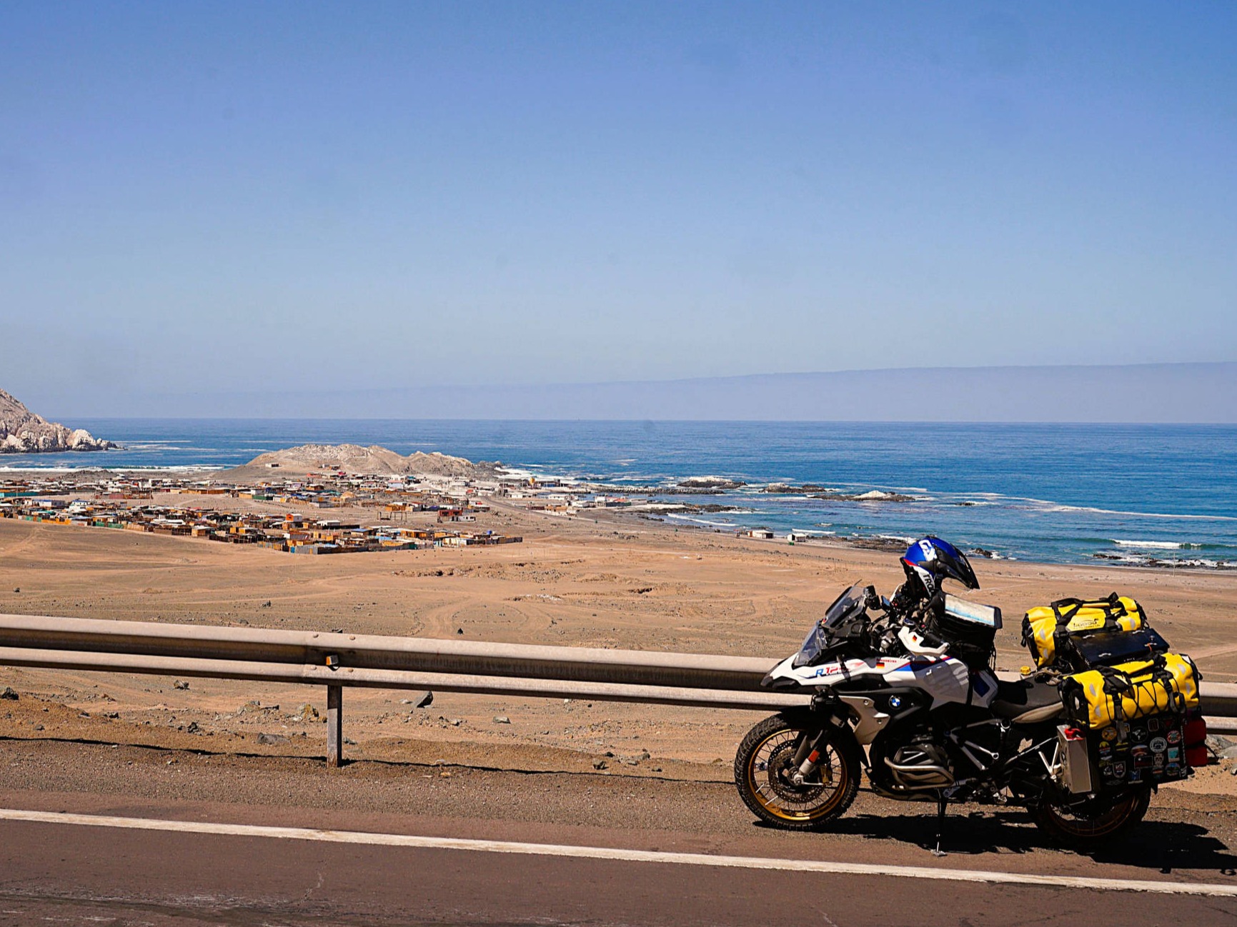 Am 6. November 2025 überqueren wir bei "Arica" die Grenze nach Chile. Die südlichste Stadt unserer Reise: "Ushuaia" erscheint in erreichbare Nähe zu rücken, obwohl uns noch mehrere tausend Kilometer davon trennen. Wegen der Regenzeit in Südperu und Bolivien von November bis März angeln wir uns auf der "Panamericana Sur" die Küste bis "Antofagasta" entlang. Ab 9. Dezember 2025 wollen wir auf der "Navimag Fähre Esperanza" durch die traumhafte Inselwelt und Fjorde Südchiles von "Puerto Montt" nach "Puerto Natales" crusen, um unser südlichstes Ziel "Ushuaia" rechtzeitig vor Weihnachten zu erreichen. Unsere Route von "Arica" nach "Pozo Almonte" führt uns auf der "Panamerica Sur" zunächst durch das fruchtbare "Azapa-Tal" mit seinen großen Olivenhainen. Am Ausgang von "Arica" informiert uns ein Schild, dass die nächste Tankstelle 259 km entfernt sei. Unsere Tanks sind randvoll und 7 l Ersatzbenzin führen wir zusätzlich mit. Daher beunruhigt uns die Einsamkeit der Passstraße und der starke Gegenwind kaum. Wir sind in der rauen Schönheit der "Atacama- Wüste" angelangt und überqueren über die Pässe "Cuestas de Acha", "Chaca" und "Camarones" nahezu vegetationslose, zerklüftete Gebirge. Die Ausblicke auf tiefe Schluchten und ausgetrocknete Täler sind absolut spektakulär. Nach "Cuya" wird die Landschaft zunehmend flacher und karger, eine schier endlose Weite breitet sich vor uns aus, die nur von Salzpfannen und gelegentlichen kleinen grünen Oasen unterbrochen wird. Diese monotone Kargkeit der Landschaft, die wir in diesem Ausmaß bisher noch nicht erlebt haben, überwältigt uns trotz der unmenschlichen Hitze durch ihre fast surreal wirkende, an eine Marslandschaft erinnernde Schönheit. Kurz vor "Pozo Almonte" zeigt Brigittes Tank Null km an. Wir passieren mehrere Geisterstädte, die der Salpeterbergbau hinterlassen hat und sehen uns schon in der Hitze bei extrem böigem Wind gedanklich im Nirgendwo verloren im Sand. Buchstäblich mit dem letzten Tropfen Benzin erreichen wir eine Tankstelle am Rande von "Pozo Almonte". Das Leben der Einwohner scheint sich in dieser Ansiedlung auf die zentrale Einkaufsstraße zu fokussieren, die uns mit ihren eingeschossigen Holzgebäuden, vorgesetzten überdachten Veranden und - fast stilecht-, einer Pferdekutsche stark an eine amerikanische Westernstadt erinnert. Im "General Store" besorgen wir uns die für Chile notwendigen Elektrostecker und SIM-Karten und erfahren, endlich wieder online, vom Ende der Ampelregierung in Deutschland. In der kargen Wüstenlandschaft entdecken wir immer wieder Bauruinen ehemaliger Salpeterwerke und verlassener Arbeitersiedlungen. Durch den Besitz reicher Salpetervorkommen als Ergebnis der Salpeterkriege und der Friedensabkommen mit Peru (1883) und Bolivien (1904), erreichte Chile beträchtlichen wirtschaftlichen Wohlstand. Mit der Entwicklung neuer Verfahren zur Salpetergewinnung und der Entdeckung des synthetischen Düngers zu Beginn des 20. Jh. verlor der Salpeterabbau seine Bedeutung im internationalen Handel und fand als Devisenbringer in Chile ein Ende. Wir durchqueren die trockene Ebene der "Reserva Nacional Pampa del Tamarugal ", eines der trockensten Gebiete der Welt, bevor wir in "Iquiquen" nach abenteuerlichen Serpentinen wieder den Pazifik erreichen, um entlang der schroffen und steilen Felsenküste der Küstenkordillere "Tocopilla" anzusteuern. Unterwegs beobachten wir Berge nasser und getrockneter "Cochayuyo-Algen", die von Frauen und Männern mühsam aus dem Meer gefischt werden. Für ganze Familien ist das Sammeln und Verkaufen der Algen neben dem Fischfang in diesem strukturarmen Gebiet die einzige Lebensgrundlage. Die Algen, die reich an Nähr- und Ballaststoffen, Mineralien und Vitaminen sind, werden in der Kosmetik- und Nahrungsindustrie verarbeitet. Die "Cochayuyo-Alge" ist ein traditionelles Nahrungsmittel, das schon die "Mapuche"-Ureinwohner kannten und als Superfood nun auch in der Haute Cuisine Einzug gehalten hat. Je mehr wir uns "Tocopilla" nähern, desto dichter ist der Strand mit Bretterbuden, die teils kleine Ansiedelungen ausbilden, verbaut. Als Schutz vor dem starken Wind sind die verlassen wirkenden Häuser mit blickdichten Bastzäunen umschlossen. Was für ein unvorstellbar hartes Leben der Fischer und "Algensammler"! Surreal wirkende, karge Wüstenlandschaften vor felsigen, zerklüfteten Hügeln und gelegentlichen Salzpfannen, mit Farbnuancen von hellem Beige bis zu Rot- und Brauntönen mit dem blauen Pazifik im Hintergrund, schaffen eine außergewöhnliche Kulisse. Wir biegen kurz vor "Antofagasta" ins Landesinnere ab. Wie eine Fata Morgana tauchen aus der flirrenden Hitze der "Atacama Wüste" die riesigen Umrisse mehrerer Industrieanlagen auf. In "La Negra" konzentrieren sich an der "Panamericana Sur" seit der Jahrtausendwende Unternehmen der Bergbauindustrie, u.a. Kupferhütten sowie Produktionsanlagen für Lithiumbatterien. Wegen des hohen Strombedarfs dieser Industrien bedecken gigantische Solarkraftwerke die Wüstenflächen. Die gesamte Stadt ist mit einer feinen weißen Pulverschicht bedeckt, die sowohl von dem örtlichen Zementwerk, als auch von den Verarbeitungsprozessen der Bergbau- und Metallverarbeitungsindustrien herrührt. Die Umweltverschmutzung und die Belastung der hier tätigen Menschen ist erheblich: Giftstoffe wie Schwermetalle belasten Boden, Luft und Wasser. LKW-Konvois verstopfen die 4-spurige Durchgangsstraße und wirbeln den Pulverstaub auf, die ganze Atmosphäre wirkt extrem apokalyptisch. Schnell füllen wir unsere Benzintanks auf, bevor wir wieder in die lebensfeindliche Monotonie der heißen Wüstenebene eintauchen. Von Weitem zeichnet sich am Horizont die Großskulptur "Mano del Desierto" des chilenischen Bildhauers Mario Irarrázabal ab, ein "must-see" und beliebtes Fotomotiv in der dramatischen Schönheit der chilenischen Wüstenlandschaft - gerade auch für Motorradfahrer. Die 1992 geschaffene, 11 m hohe Eisen- und Zementhand soll Gefühle vo