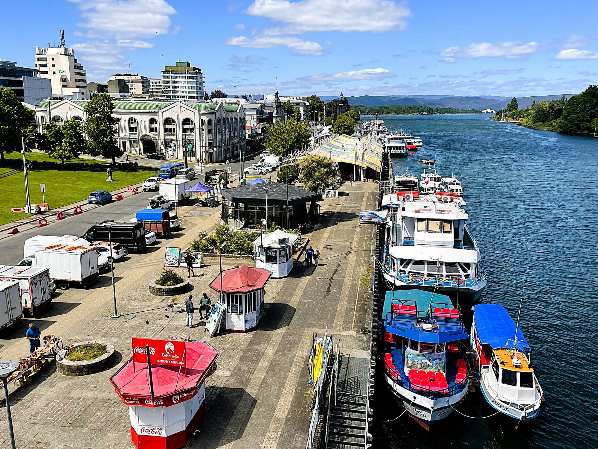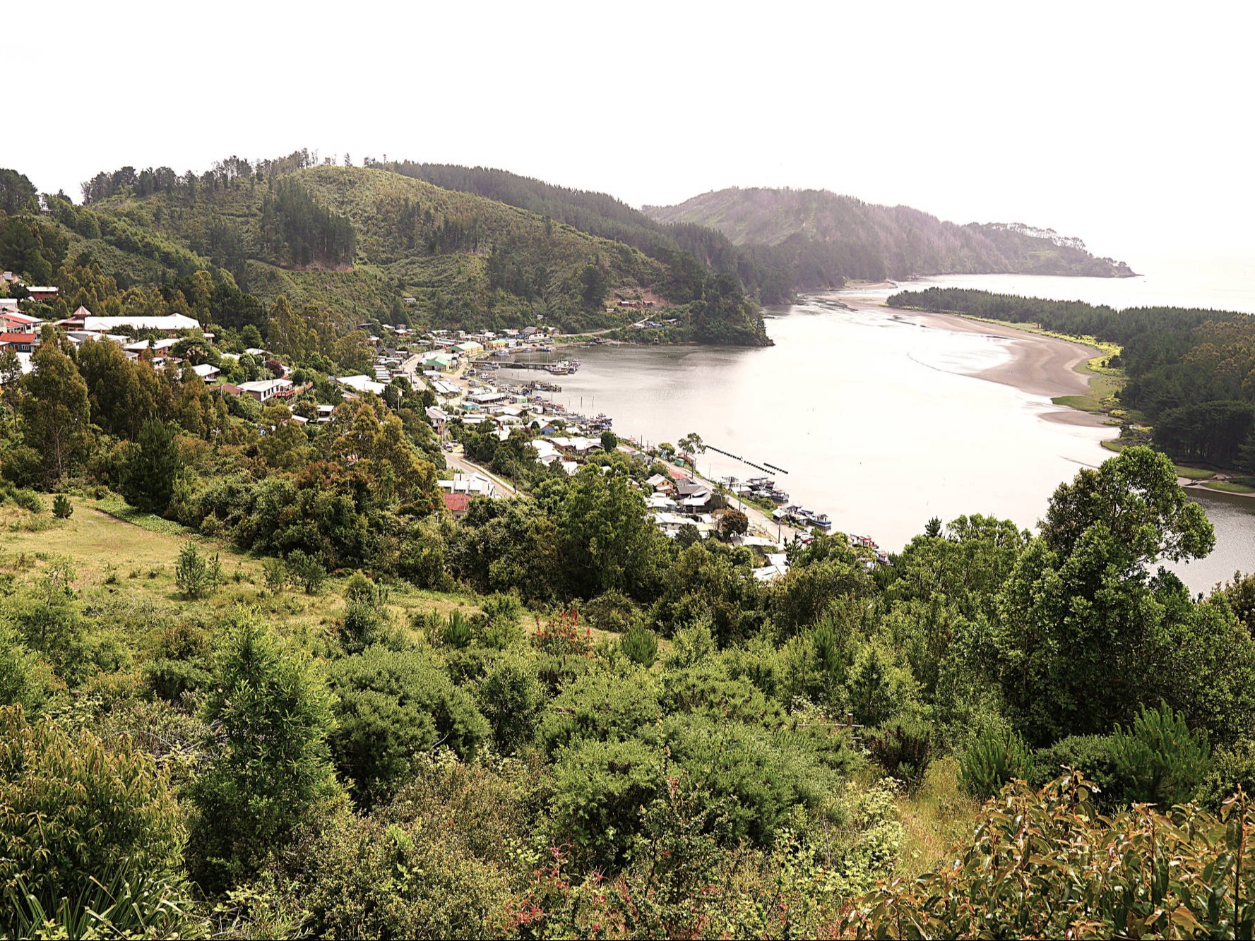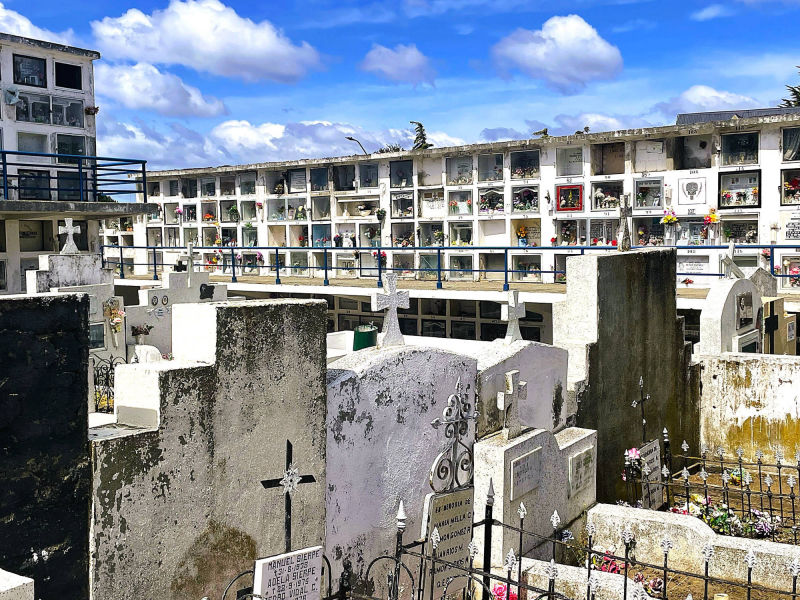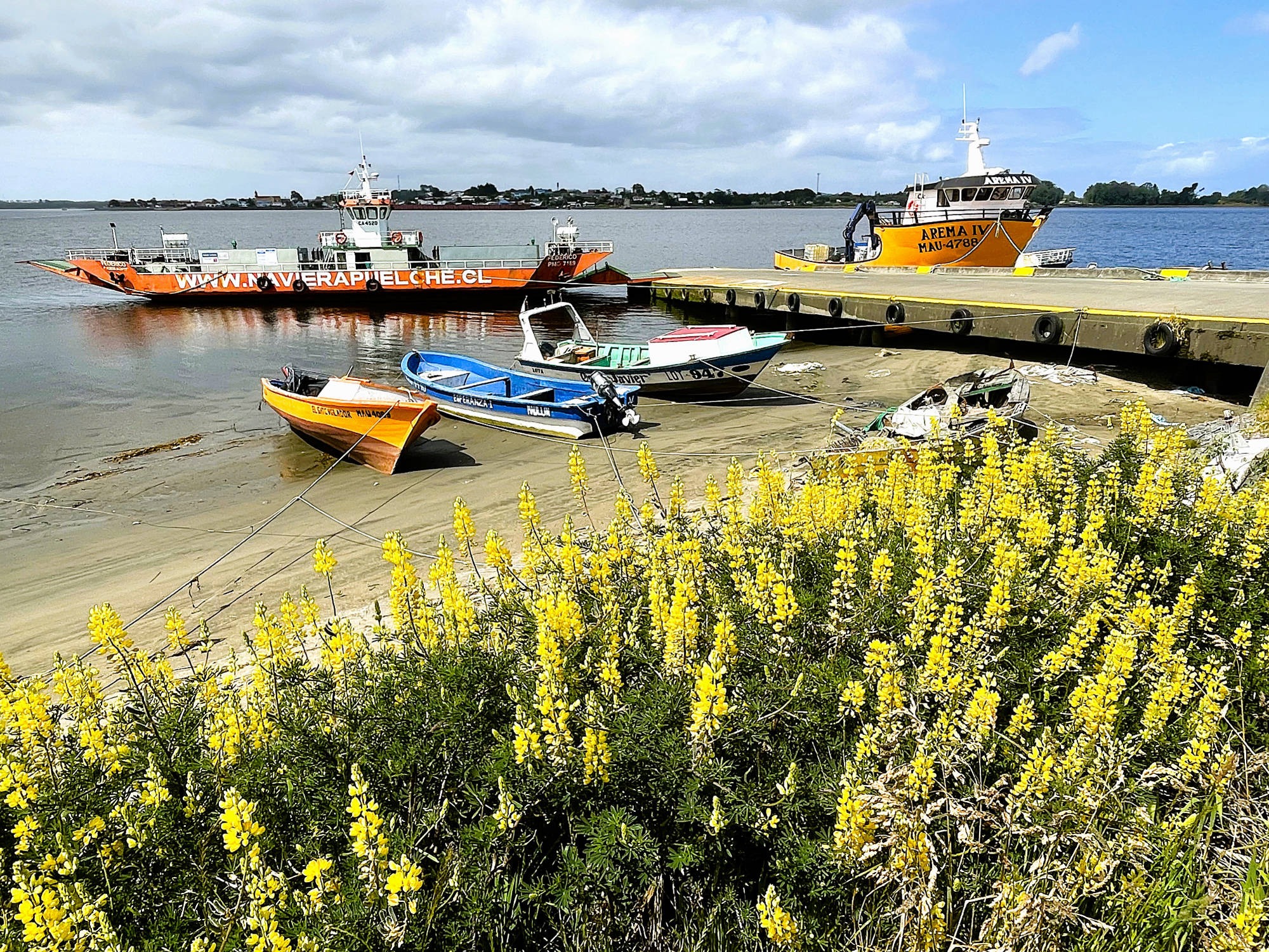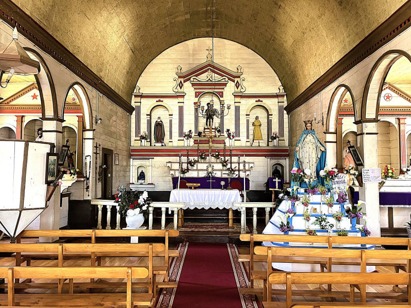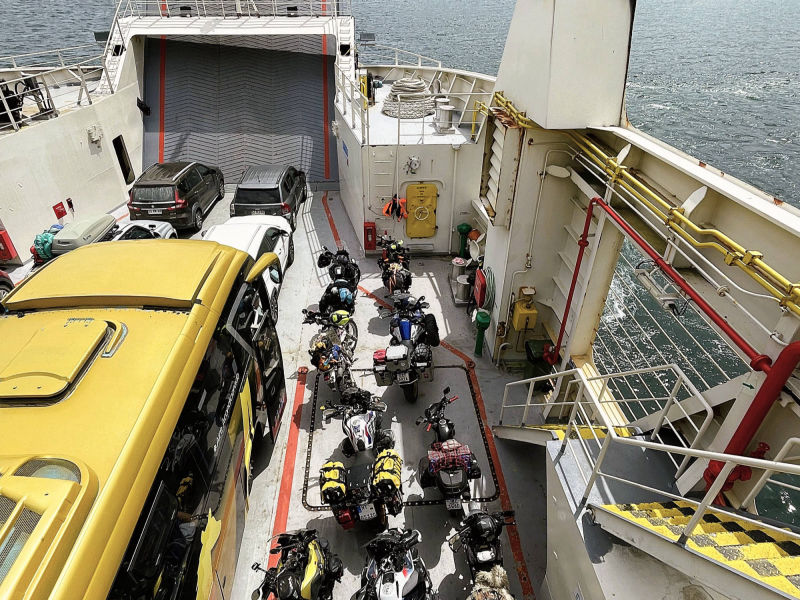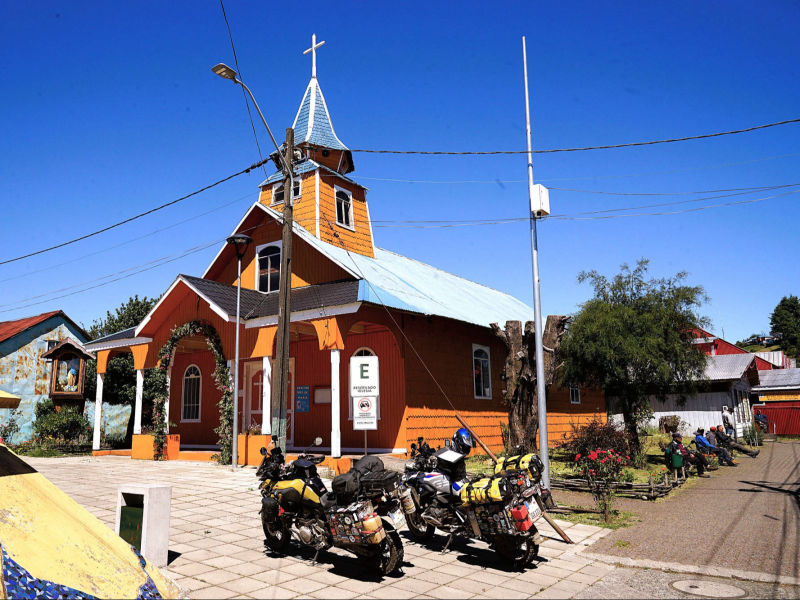 Wir: fühlen uns noch immer wie im Alpenvorland: auf den Wiesen zwischen großen Weizenfeldern grasen schwarzweiße Kühe, die kleinen Dörfer mit ihren oft rostrot angemalten, meist eingeschossigen Holzfassaden sind gepflegt und einladend. Kurz vor "Maullín" endet die Straße abrupt am Fährhafen. 30 min. warten wir auf die kleine Fähre, die uns in wenigen Minuten über den "Rio Maullín" transportiert. Auf die zweite Fähre über den 2 km breiten Kanal von "Chacao" zur 8.394 km² großen "Isla Grande de Chiloé" werden wir dagegen direkt draufgewunken. Die Insel gilt neben Peru als eine der möglichen Urheimaten der Kartoffel. Noch heute werden dort ca. zweihundert unterschiedliche Kartoffelsorten angebaut. 1608 erreichten Jesuiten, von denen viele aus Bayern kamen, die Insel und begannen mit der Errichtung von Kirchen zur Missionierung der "Mapuche- und Chono-Indianern" . 1767 wurden die Jesuiten von der Insel vertrieben, doch die Franziskaner setzten die Missionierungsarbeit fort. Die dauerhafte Christianisierung der Insel schlug fehl, aber 150 Holzkirchen blieben erhalten, darunter 16 Kirchen, die seit 2000 zum UNESCO-Weltkulturerbe zählen. Die Kirchen weisen Elemente europäischer und indigener Elementen auf, sie wurden aus einheimischem Lärchen- und Zypressenholz errichtet und von Holzdübeln anstatt mit Nägeln zusammengehalten. Ihre Fassaden wurden oft in leuchtenden Farben angestrichen, auch die Innenräume sind meistens farbenfroh gestaltet. Die Dächer der Kirchen bestehen aus farbigen Holzschindeln, die teilweise besonders kunstvoll ineinander gesteckt wurden. In "Ancud" spazieren wir die belebte "Calle Pudeto" entlang und wandern von der "Plaza de Armas" vorbei an der ebenfalls besuchenswerten Markthalle bis zum Hafen und zur Uferpromenade. Auch das Schweizer Motorradpaar Beate und Fabrice hat sich weitestgehend von allem Materiellen in ihrer Heimat am Lausanner See getrennt. Die Chemie zwischen uns stimmt auf Anhieb, bis tief in die Nacht tauschen wir unsere spannenden Erlebnisse auf zwei Rädern aus. Auf der Suche nach den historischen Holzkirchen kurven wir durch eine liebliche, leicht hügelige Landschaft. Manche der nicht unter Schutz stehenden Kirchen sind frevelhaft mit Wellblech "saniert" und oft in einem erbärmlichen baulichen Zustand. Dagegen wird die schlichte, gut erhaltene ergraute Holzkirche in "San Juan" "bewacht:" drei Schiffe unter einem Tonnendach enden jeweils mit farbenfrohen Altären. Von "Prudhoe Bay" am Arktischen Ozean aus führt "die längste Traumstraße der Welt" auf 25.750 km und bis 4.700 m Höhe durch arktische Zonen, Wüsten, Regenwälder oder Hochgebirge von 14-19 Ländern (je nach Streckenverlauf), nur unterbrochen von 90 km Urwald am "Darian Gap". Im Dorf "Punta de Lapa", fünf Kilometer südlich von "Quellón", endet die "Panamericana" völlig unspektakulär mit einem Markstein Kilometer Null ("Hito Cero") und einer "Anker-Skulptur mit 4 weißen Stahlstützen, die mikadoähnlich aneinander lehnen und dringend eines neuen Farbanstrichs bedürften. Wir übernachten in "Quellón" in einer sehr schmuddeligen Wohnung und sind erleichtert, auf der monotonen "Panamerica" bei Dauerregen zurück in den Norden zu entkommen. Noch einmal überqueren wir den Kanal von "Chacao" mit der Fähre, da die Fertigstellung der 2.750 m langen Hängebrücke zwischen "Chiloé" und Festland erst für 2028 terminiert ist. In der rauen See entdecken wir 3 Brückenpfeiler, die jedoch noch weit von ihren geplanten Höhen entfernt sind. Die Hafenstadt "Puerto Montt" wurde trotz der bergigen Situation in der für koloniale Gründungen typischen schachbrettartigen Form 1853 angelegt. Fast einen Tag dauert die Beladung der Fähre "Esperanza" des Unternehmens "Navimag", bei herrlichem Sonnenschein stechen wir am Spätnachmittag des 9. Dezember endlich in See..